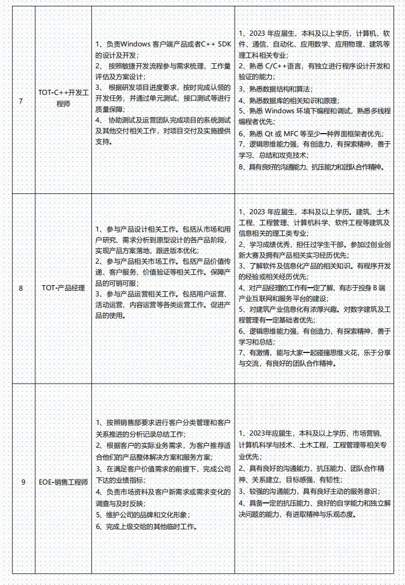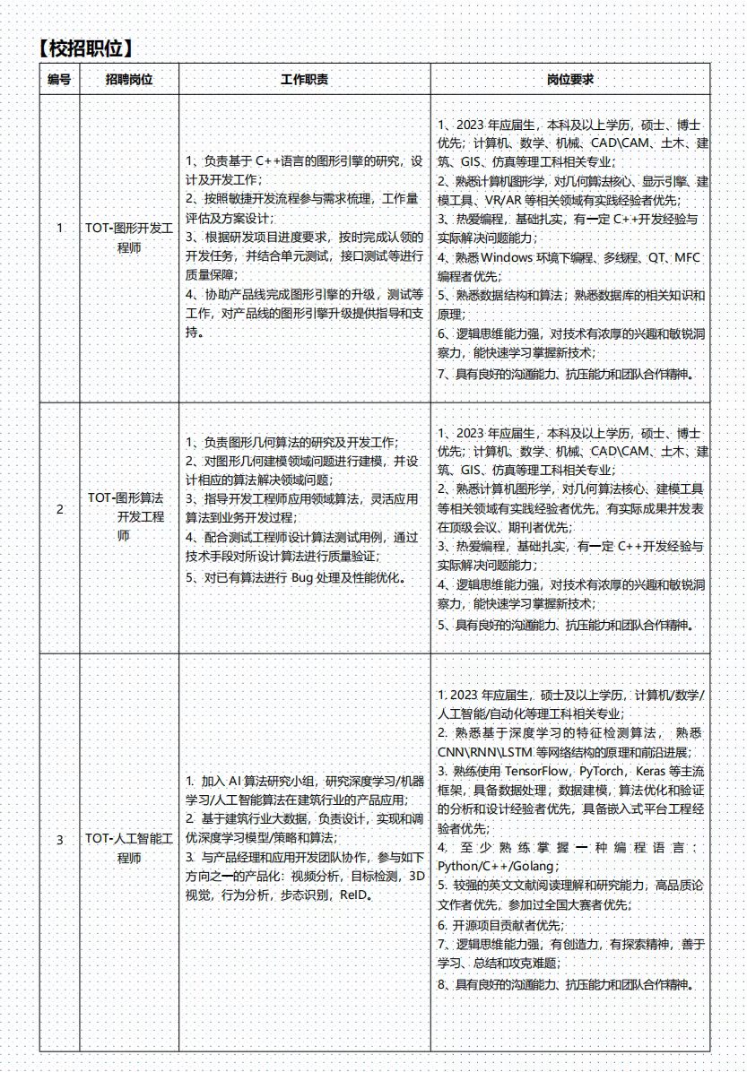 2023届广联达集团春季校园招聘项目于2022年 3月正式启动。广联达集团TOT 研发序列提前批校园招聘包含图形开发工程师、Java开发工程师、产品经理等8种校招岗位,广联达渠道分支EOE 销服序列暑期实习生校园招聘包含销售工程师、服务工程师、实施工程师3种校招岗位。两个序列面向全球2023 届(毕业时间:2022年10月-2023 年7月)本科及以上学历的精英学子发出邀请,欢迎同学们踊跃参与!
