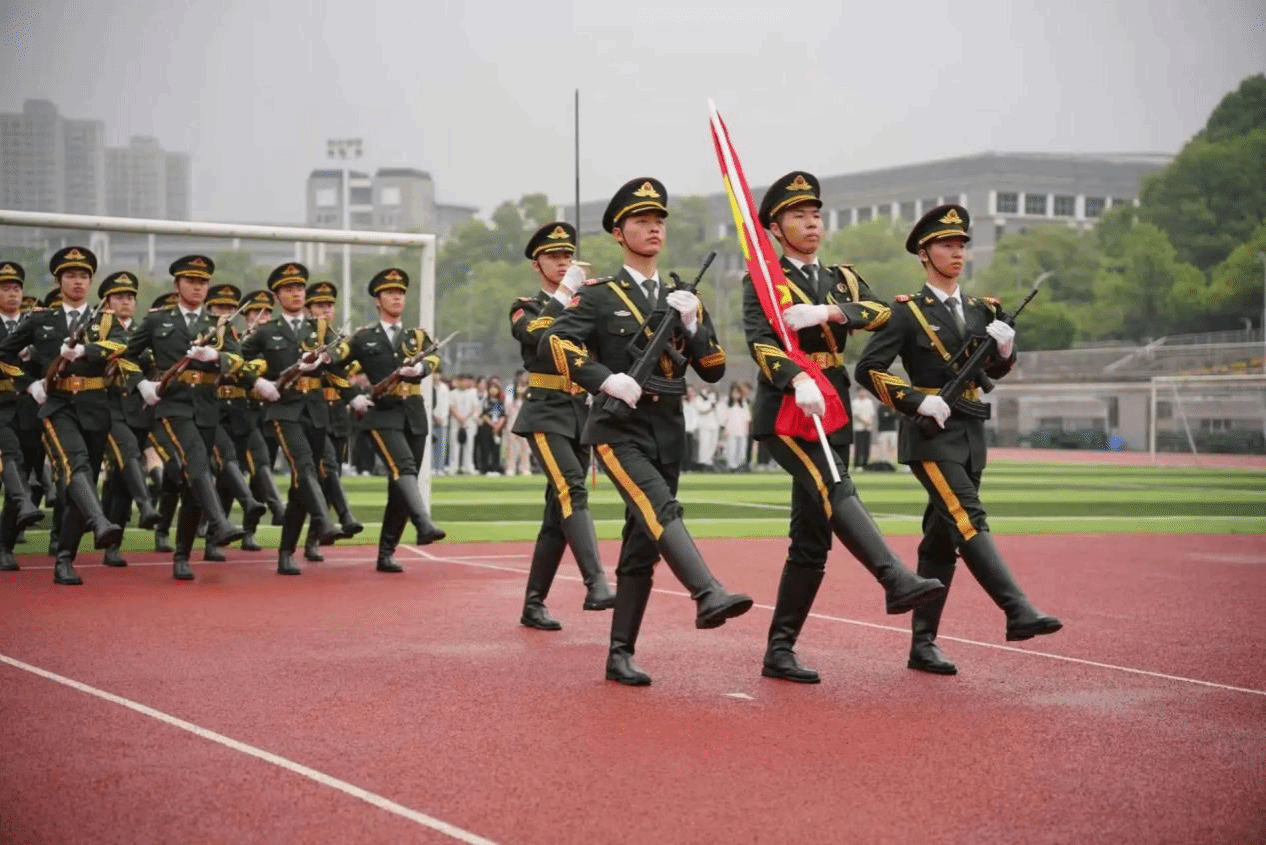 仪式伊始,国旗护卫队迈着整齐有力的步伐,护送五星红旗入场,现场师生庄严肃立。随着激昂的国歌奏响,五星红旗冉冉升起,全体师生行注目礼,齐唱国歌。