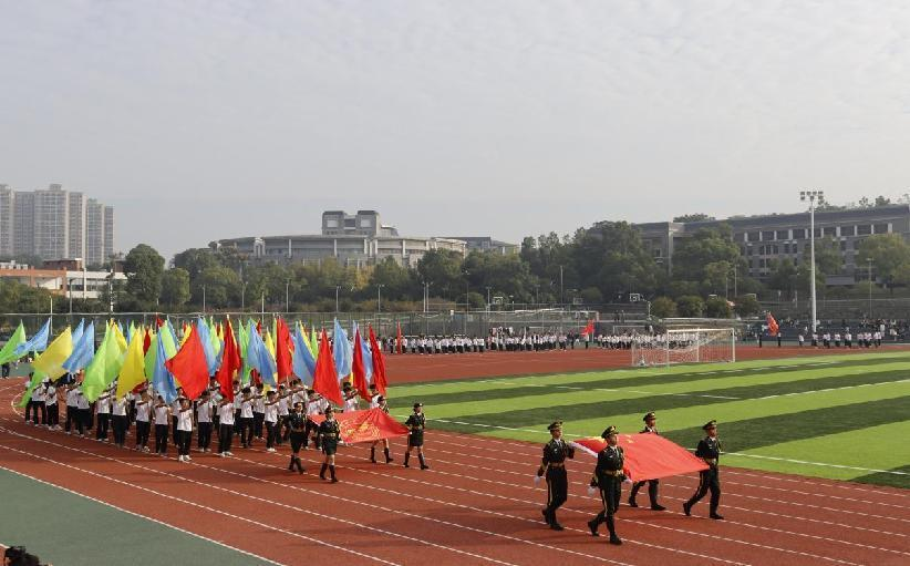 入场式结束后,五星红旗伴随国歌冉冉升起,全体师生行注目礼。随后胡穗董事长发表开幕致辞,强调体育运动对员工身心健康的重要性,鼓励同学们发扬拼搏精神,并预祝运动会成功。