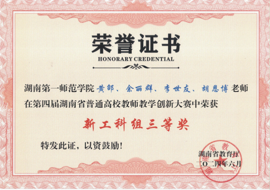 6月5日,公司黄邵老师作为首次参加湖南省普通高校教师教学创新大赛的青年教师,在竞赛中展现了扎实的教学功底和高超的教学技能,最终获得新工科组三等奖。
